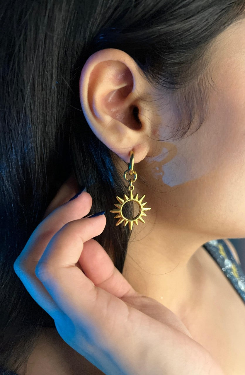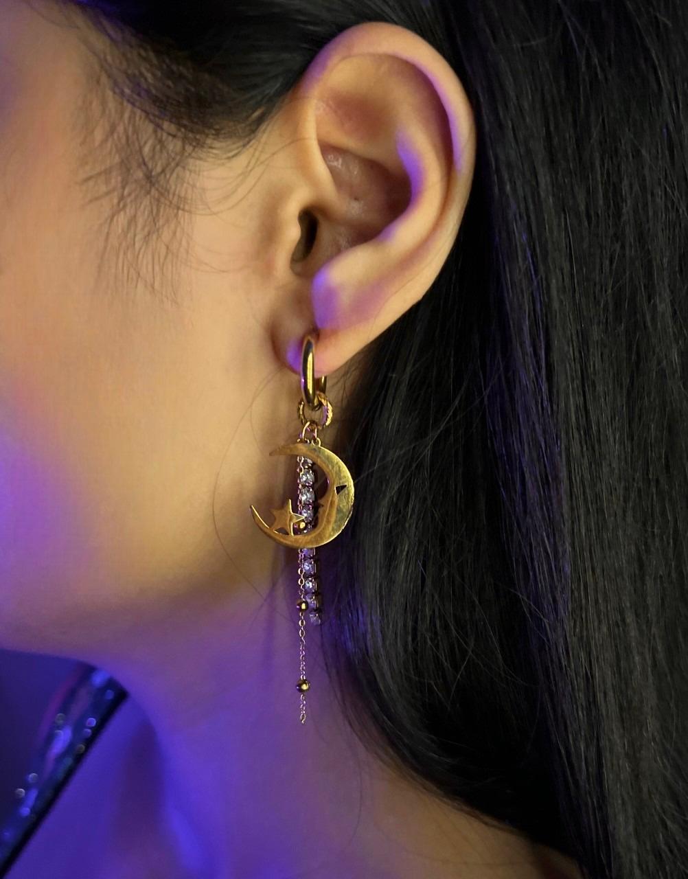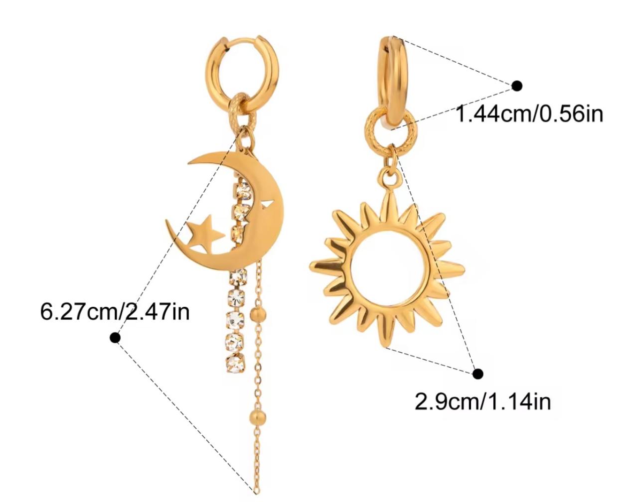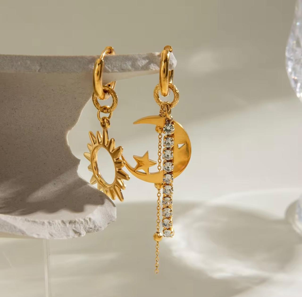 This mismatched gold earring set features a radiant sun charm on one side and a dreamy crescent moon with a star and crystal chain on the other, creating a perfect contrast of light and mystery.