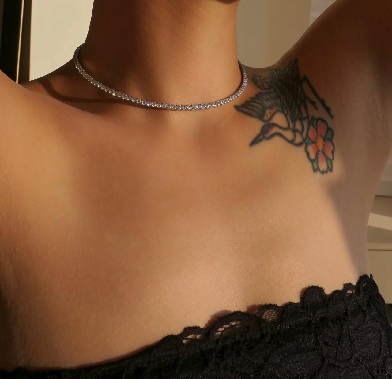 The Diamond Choker is your go-to piece for effortless sparkle. This dainty tennis-style necklace features a row of shimmering stones that catch the light with every movement, giving you that golden-hour glow all day long